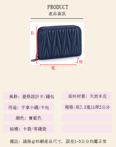• 菱格設計天然羊皮卡包/小錢包-寶藍色